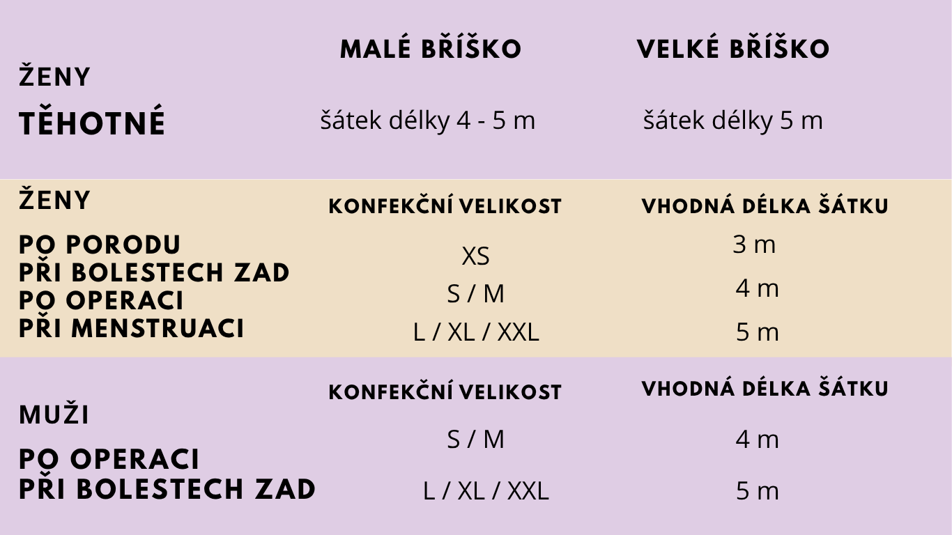 Délku šátku nevolte podle Vaší výšky, ale podle aktuální konfekční velikosti, případně podle velikosti bříška v těhotenství.